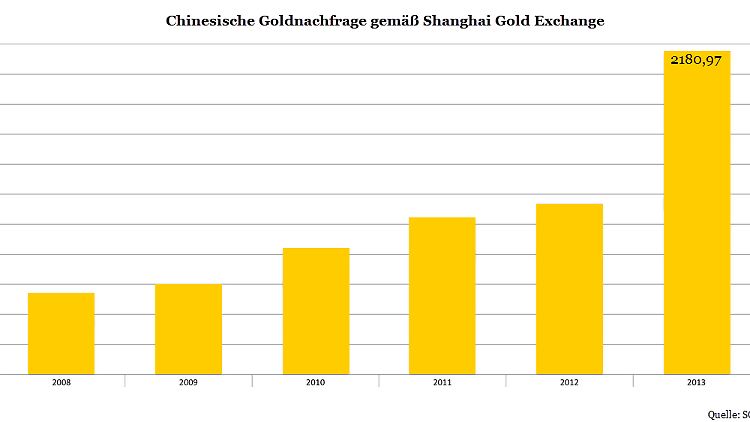 An der Shanghai Gold Exchange – die Edelmetall-Börse erfasst alle offiziellen Goldtransaktionen in der Volksrepublik ohne etwaige Käufe der Notenbank - wurden im laufenden Jahr bis Mitte April bereits 635 Tonnen Gold gehandelt. Verglichen mit dem entsprechenden Vorjahreszeitraum bedeutet dies einen weiteren Anstieg von zehn Prozent, so dass die Gesamtrekordnachfrage des Jahres 2013 von 2181 Tonnen Gold wieder erreicht oder sogar übertroffen werden könnte. Zudem zeigen die Statistiken der Shanghai Gold Exchange, dass die Angaben der Lobbyvereinigung World Gold Council zu tief ausfallen dürften.