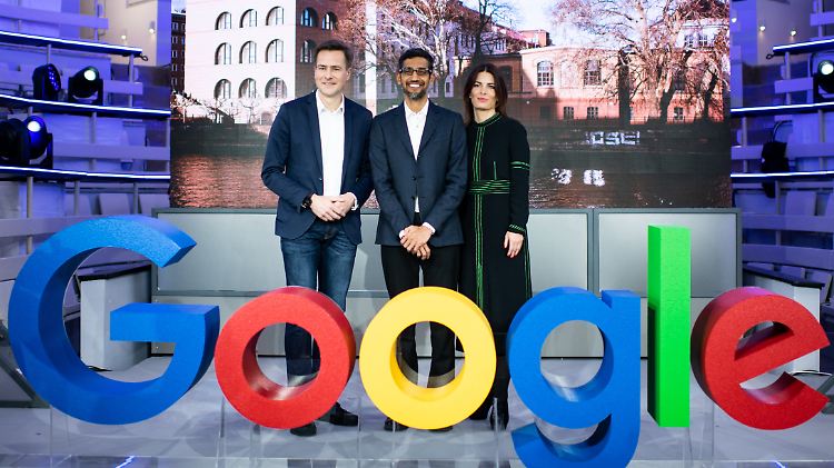 Philipp Justus (l-r), Google-Vizepräsident für Zentraleuropa und die deutschssprachigen Länder, Sundar Pichai, CEO von Google, und Annette Kroeber-Riel, Senior Director Public Policy & Government Relations.