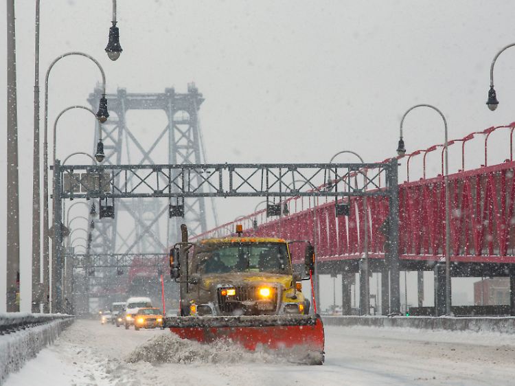 Schnee und Eis behindern seit Wochen den Verkehr: Ein Schneepflug kratzt über das frische Eis auf der Williamsburg-Bridge zwischen Brooklyn und Manhattan.