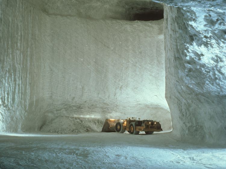 Rohstoffe aus der Tiefe: Mit einem Schaufelinhalt von bis zu 20 Tonnen nehmen Lader das Grobmaterial auf und bringen es zu Brecheranlagen, wo es zermahlen wird.