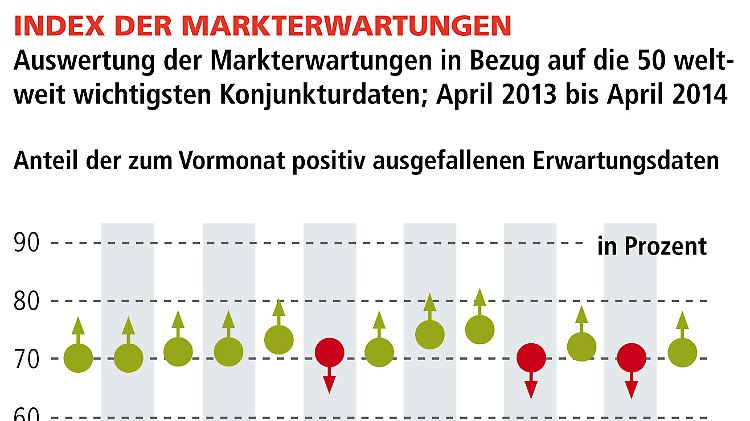 Gerade die zukunftsorientierten Daten haben den breiten Marktkonsens allesamt positiv überraschen können. Dies gilt nach Auffassung des Vermögensverwalters als Beleg dafür, dass die Stimmung und Psychologie der Wirtschaft und der Märkte vor dem Hintergrund der Krise in der Ukraine unverändert leicht negativ geprägt ist. Dies bescheinigt auch der "Index der Markterwartungen" mit einem leicht angestiegenen Niveau von 71% (Vormonat: 70%). "Die realwirtschaftliche Ausgangsposition ist positiv und bietet für das zweite Halbjahr 2014 eine gute Ausgangslage", so der Vermögensverwalter.