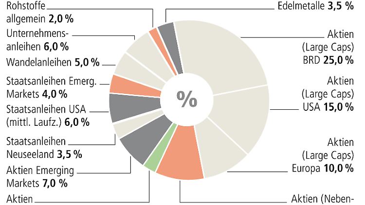 Asset-Allokation: Im monatlichen Musterdepot wird der gesamte Aktienanteil auf 70% beibehalten. Folgende Quoten werden erhöht: Aktien Large-Caps Japan von 0% auf 3%, Aktien Emerging Markets von 2% auf 7%, Staatsanleihen aus den USA (mittler e Laufzeit) von 4% auf 6%, Edelmetalle von 2% auf 3,5%; Folgende Quoten werden reduziert: Aktien Nebenwerte Deutschland von 15% auf 10%, Staatsanleihen aus Emerging Markets von 5,5% auf 4%, Rohstoffe von 4% auf 2%; Unverändert bleiben: Aktien Large-Caps Deutschland 25%, Aktien Large-Caps USA 15%, Aktien Large-Caps Europa 10%, Staatsanleihen aus Neuseeland 3,5%, Wandelanleihen 5%; Unternehmensanleihen 6%;