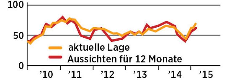 Zuversicht spiegelt auch die Prognose für die kommenden zwölf Monate. Der Erwartungswert legte zuletzt um knapp neun Prozent auf 68,5 Punkte zu.