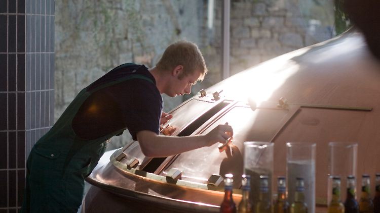 Ein Braumeister der Bionade GmbH schaut in einen Sudkessel - an dieser Stelle werden die flüssigen von den festen Bestandteilen getrennt
