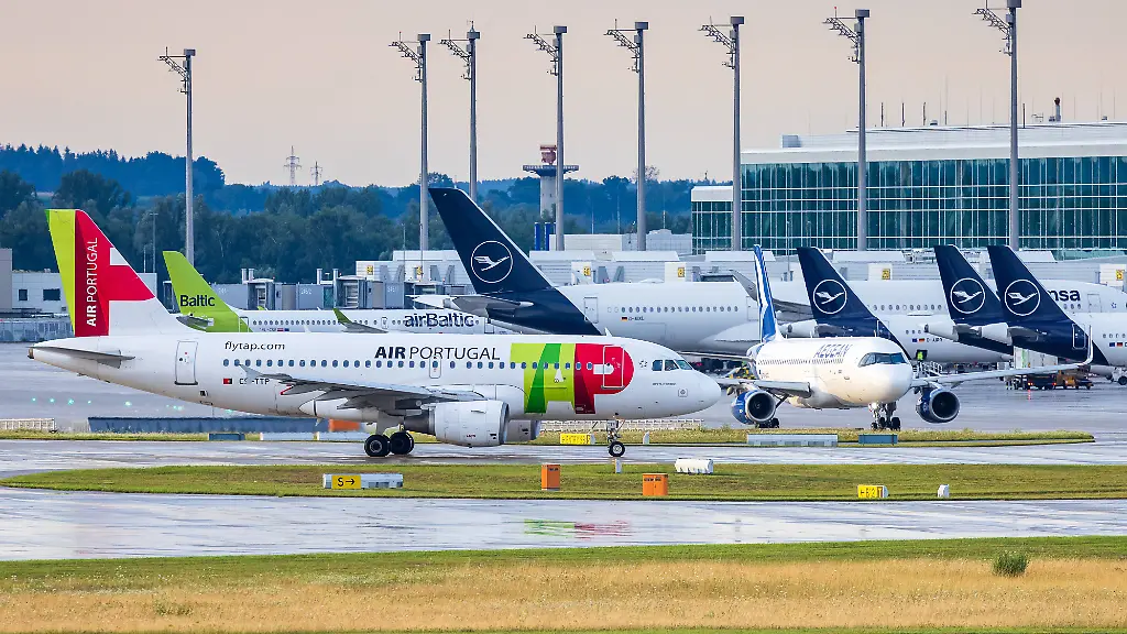 Abendlicher-Flugbetrieb-auf-Start-und-Landebahn-des-Muenchner-Flughafens-Oberding-15-07-2025-Ein-Passagierflugzeug-der-portugiesischen-Fluggesellschaft-TAP-Air-Portugal-mit-der-Registrierung-CS-TTP-rollt-am-Flughafen-Muenchen-vor-mehreren-abgestellten-Maschinen-darunter-Flugzeuge-von-airBaltic-Aegean-Airlines-und-Lufthansa-Die-abgebildete-Maschine-ist-ein-Airbus-A319-TAP-ist-Mitglied-der-Star-Alliance-und-es-bestehen-aktuell-Verhandlungen-ueber-eine-moegliche-Integration-in-die-Lufthansa-Group