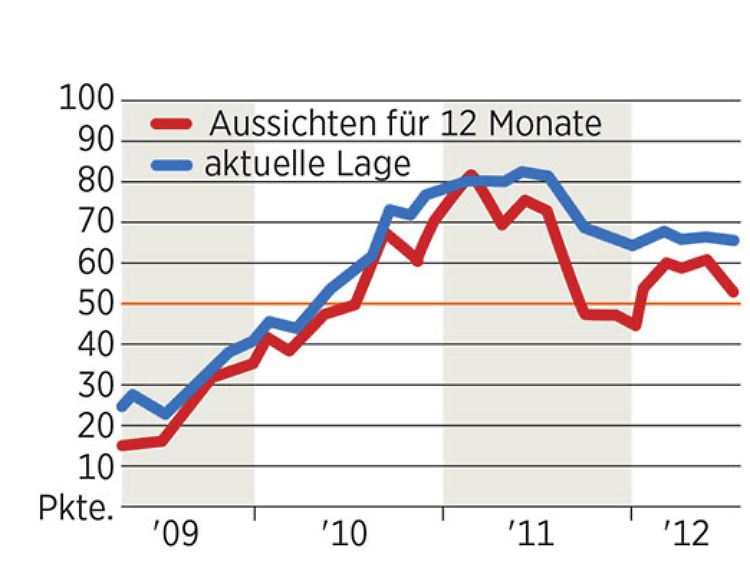 Deutschlands führende Volkswirte sehen die wirtschaftliche Entwicklung mit wachsender Sorge. Das geht aus dem Ökonomen-Barometer von n-tv und der "Euro am Sonntag" für den Juni hervor. Danach brach die Prognosekomponente zur erwarteten Konjunkturentwicklung auf Sicht von zwölf Monaten um rund 13 Prozent auf 52,5 Punkte ein. Dies war der schärfste Rückgang seit September 2011. Auch die gegenwärtige wirtschaftliche Lage beurteilen die Volkswirte zurückhaltender als noch im Vormonat. Allerdings fiel das Minus mit 2,5 Prozent vergleichsweis moderat aus.