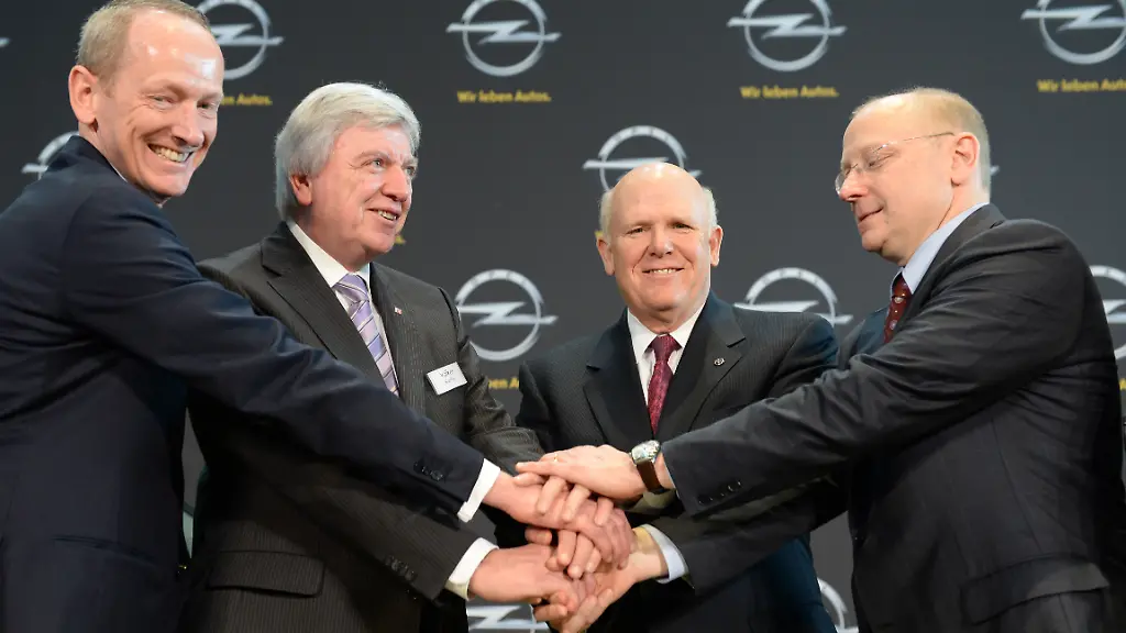 Einer für alle, alle für einen: Verschwörerisch wie die Musketiere reichten sich Opel-Chef Neumann, Hessens Ministerpräsident Bouffier, General-Motors-Boss Akerson und Opel-Chefaufseher Girsky im Opel-Hauptquartier die Hände. Die Botschaft: Der US-Autobauer investiert wieder in Europa – und sucht dafür den Schulterschluss mit der Politik. Vier Mrd. Euro will General Motors (GM) bis 2016 in seine marode Europa-Tochter Opel pumpen, die seit Jahren in den roten Zahlen steckt. "GM braucht eine starke Präsenz in Europa – sowohl bei Design und Entwicklung als auch bei Fertigung und Verkauf", beschwor GM-Chef Akerson die Zukunft der Marke mit dem Blitz. Zu den Standorten in Deutschland sagte er allerdings kein Wort.