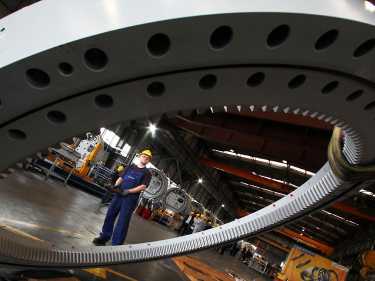 Allein das Zahnrad für die Nabe einer Windkraftanlage wiegt Tonnen: Behutsam bereitet ein Nordex-Mitarbeiter den Einbau vor.