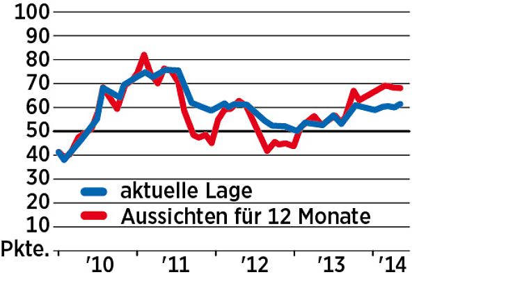 Nach einem kräftigen Jahresauftakt schätzen die führenden deutschen Ökonomen im Februar die wirtschaftliche Lage nahezu unverändert zum Vormonat ein. Damit behauptet sich der Indikator auf einem hohen Niveau, das deutlichen wirtschaftlichen Aufschwung signalisiert. Das ist das Ergebnis des Ökonomen-Barometers von "Euro am Sonntag" und dem Nachrichtensender n-tv für den Monat Februar. Der Barometer-Wert lag mit 60,6 Punkten um knapp ein Prozent über dem Vormonatswert (60 Punkte), die Prognose erreichte wie im Januar rund 68 Punkte. Die meisten Ökonomen prognostizieren für die deutsche Wirtschaft nach zwei mageren Jahren in Folge wieder deutlich stärkeres Wachstum. Die Bundesregierung erwartet für 2014 ein Plus von 1,8 Prozent und für 2015 von 2,0 Prozent. 2012 waren es 0,7 Prozent, 2013 sogar nur 0,4 Prozent.