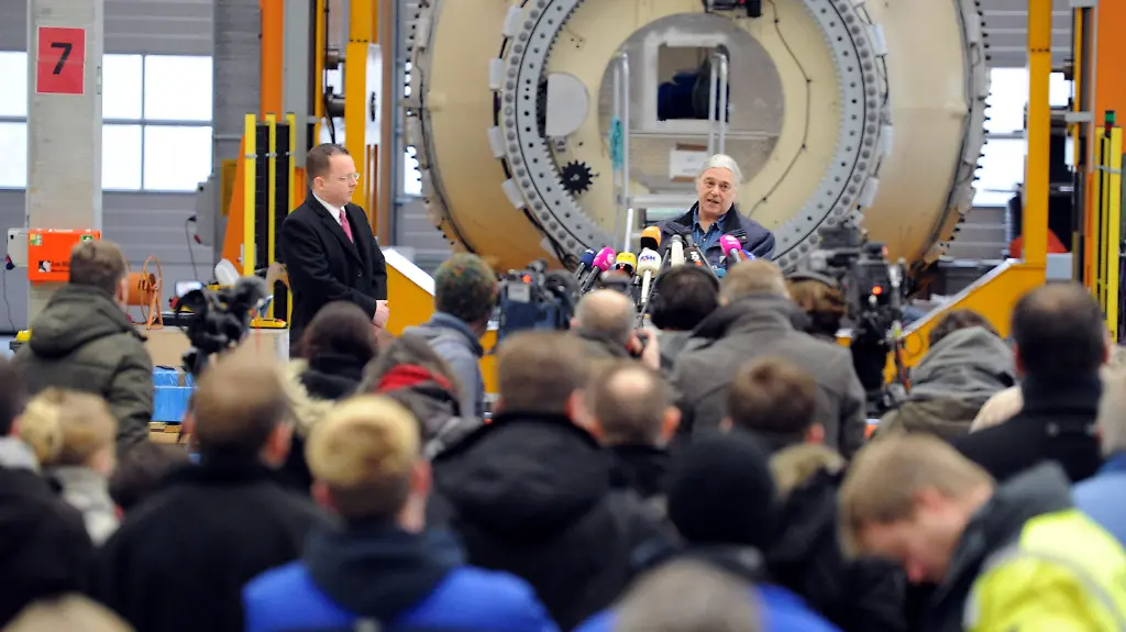 Es ist ein erstaunlicher Auftritt. Vor zahlreichen Angestellten, in einer mit Turbinenteilen bestückten kargen Werkshalle, spricht Prokon-Chef Carsten Rodbertus über den Insolvenzantrag des Unternehmens - und erntet tosenden Applaus.