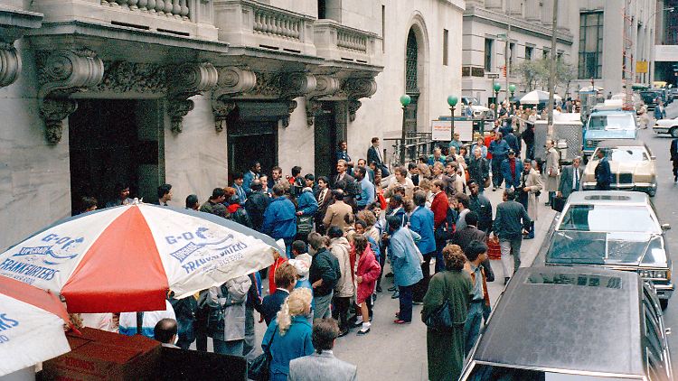 Börsen-Crash 1987: Eine lange Warteschlange vor der New York Stock Exchange. Alle wollen von der Besuchergalerie einen Blick auf die panischen Händler werfen.