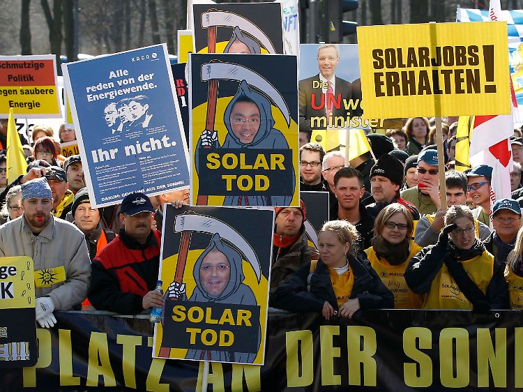 In Berlin demonstrierten am Brandenburger Tor rund 10.000 Menschen, die wegen der Pläne den Verlust von Tausenden Arbeitsplätzen befürchten. Auf Plakaten wie "Herr Röttgen, Sie sind kein Umweltminister sondern ein Atomlobbyist", "Wir sind die Energiewende" oder "Einspeisen statt abspeisen" machten sie ihrem Ärger Luft. SPD-Chef Sigmar Gabriel warf der Regierung vor, die Energiewende zu torpedieren: "Sie haben die wichtigste Grundlage für den Erfolg dieser Industrie längst zerstört. Das ist Berechenbarkeit und Planbarkeit und auf diesem verhängnisvollen Weg wollen sie jetzt weitergehen." Die Branche steht in Deutschland wegen der asiatischen Konkurrenz ohnehin unter Druck.
