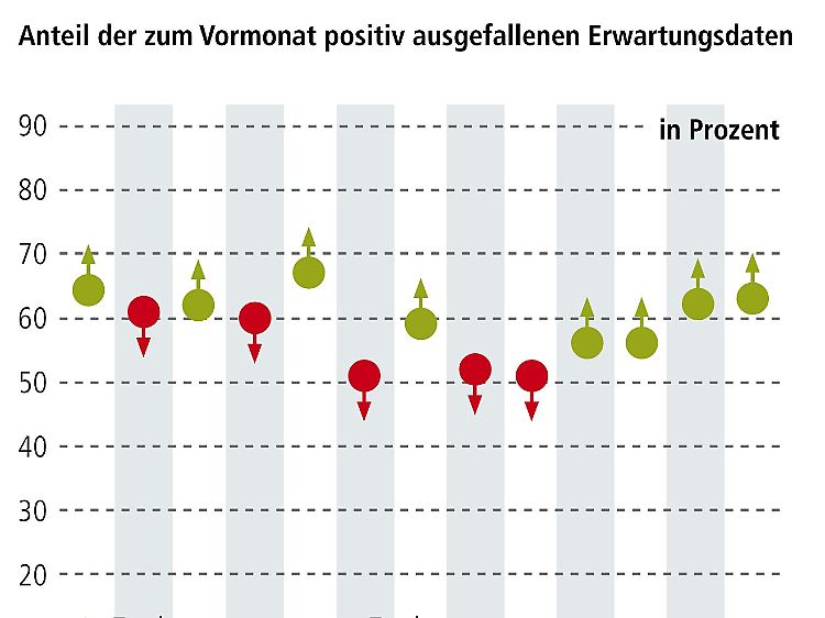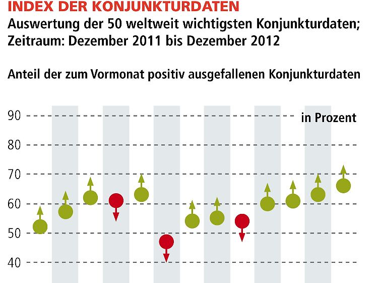 Zur Methode: Der "Welt-Index" umfasst die 50 relevantesten Konjunkturdaten, die weltweit von den Statistikämtern und Forschungsinstituten veröffentlicht werden. Zu Grunde liegen weit mehr als 1000 internationale Indikatoren aus allen wirtschaftlich relevanten Volkswirtschaften und Regionen. Dazu gehören Schwergewichte wie der Vertrauensindex der Universität Michigan, Auftragseingänge der deutschen Industrie oder Chinas Exporte, aber auch einige OECD-Frühindikatoren oder Daten zum Wirtschaftsvertrauen verschiedener, wichtiger Länder. Bewertet wird, ob ein Wert steigt oder fällt. Am Ende steht eine Prozentzahl: 50 Prozent bedeutet, dass die Hälfte aller Daten gestiegen ist. So funktioniert auch der zweite Teil des "Welt-Index", der Index der Markterwartungen, wobei hier gemessen wird, ob die Experten mit ihren Schätzungen richtig lagen.