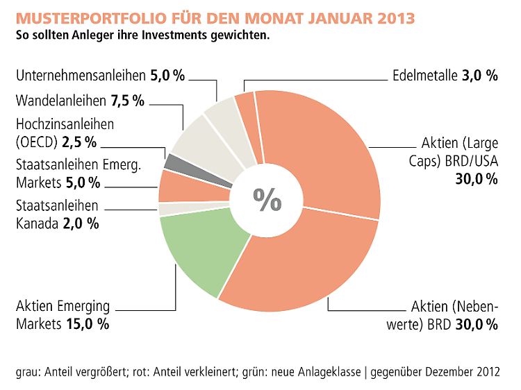 Asset-Allokation: Im monatlichen Musterdepot wird der gesamte Aktienanteil auf 75% erhöht, wobei Large - Caps aus den USA und Deutschland und Nebenwerte aus Deutschland jeweils auf 30% reduziert werden. Neuaufgenommen werden Aktien aus den Emerging Markets. Außerdem bleiben Staatsanleihen aus Kanada mit 2% bestehen, während Staatsanleihen aus Neuseeland komplett aus dem Musterportfolio herausgenommen und Pendants aus den Emerging Markets auf 5% reduziert werden. Edelmetalle werden auf 3% reduziert. Wandelanleihen und Unternehmensanleihen bleiben unverändert. Hochzinsanleihen werden leicht um 0,5 Prozentpunkte auf 2,5% erhöht.