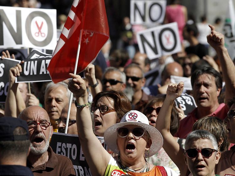 Stundenlang blockierten Hunderte Demonstranten in Madrid die Straßen. "Kürzungen für die Banker, nicht für die Arbeiter!", riefen sie vor Ministerien und öffentlichen Gebäuden. Beschäftigte der staatlichen Eisenbahn Renfe sperrten die Gleise. Mitarbeiter des lokalen öffentlich-rechtlichen Fernsehsenders TeleMadrid blockierten am Stadtrand eine Autobahn. Selbst einige Polizisten schlossen sich den Protesten an.