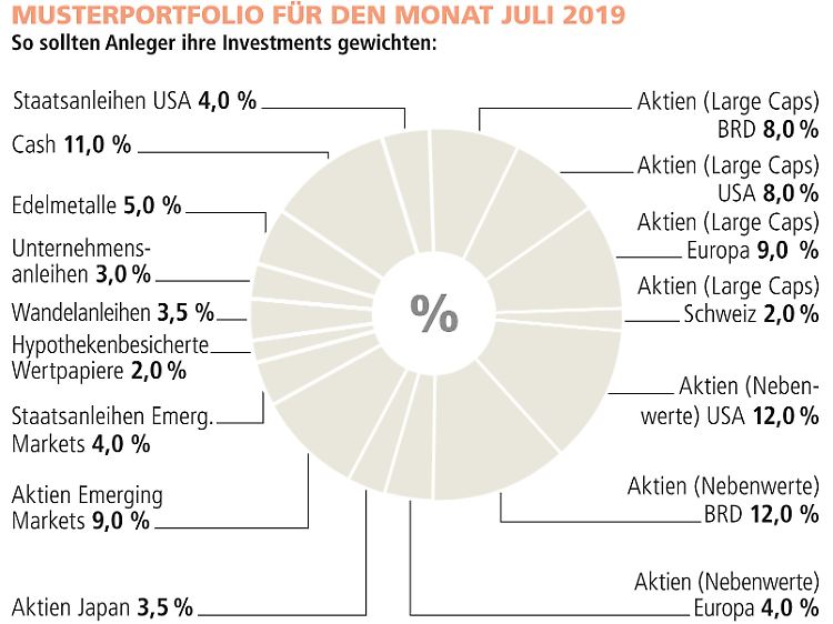 Beibehalten: Aktien USA (Large Caps) 8,00 %; Aktien USA (Nebenwerte) 12,00%; Aktien Deutschland (Large Caps) 8,00%; Aktien Deutschland (Nebenwerte) 12,00%; Aktien Europa (Large Caps) 9,00%; Aktien Schweiz 2,00%; Aktien Europa (Nebenwerte) 4,00%; Aktien Japan 3,50%; Aktien Emerging Markets 9,00%; Staatsanleihen USA 4,00%; Staatsanleihen Emerging Markets 4,00%; Wandelanleihen 3,50%; Hypothekenbesicherte Wertpapiere 2,00 %; Unternehmensanleihen 3,00%; Edelmetalle von 5%; Cash 11,00%.