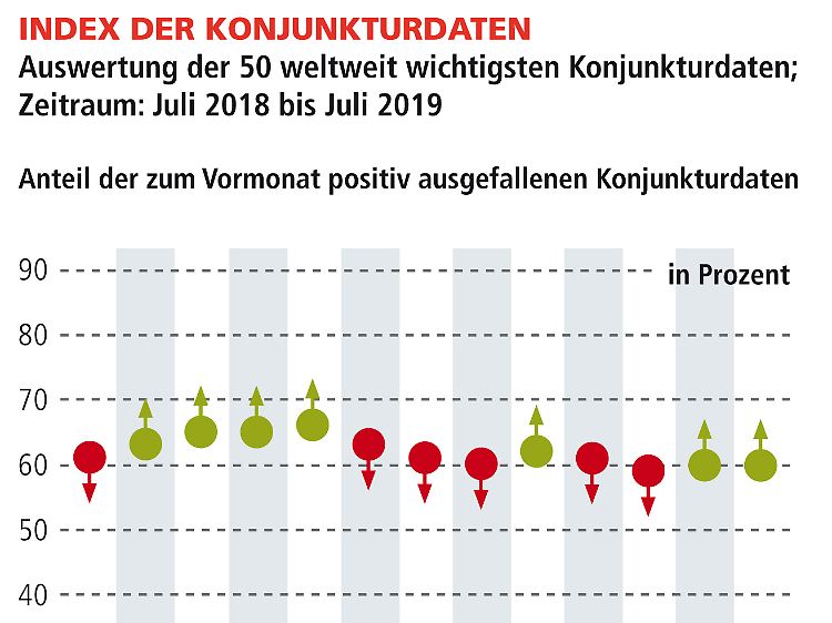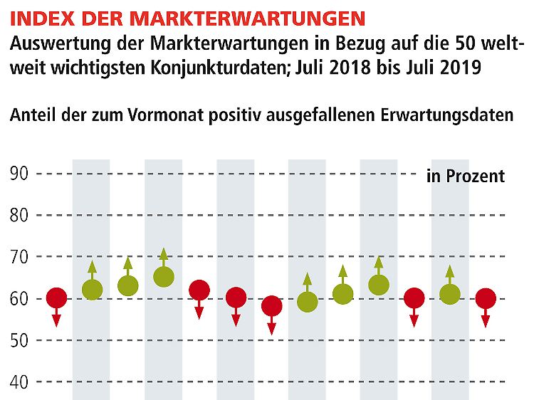 Der "Welt-Index der Konjunkturdaten" stabilisiert sich im Juli zum zweiten Mal in Folge, leicht negativ tendiert allerdings der "Index der Markterwartungen". Diese geringe Eintrübung sollte allerdings nicht überbewertet werden. Noch immer stehen Stimmungsindikatoren unter dem Einfluss der großen Notenbanken. Sowohl die Europäische Zentralbank als auch die US-Notenbank (Fed) befinden sich wieder auf einem expansiven Kurs. Dies hat in erster Linie Einfluss auf Stimmungsindikatoren, wie beispielsweise die Einkaufsmanagerindizes. Für diese Erhebungen werden Entscheider befragt.