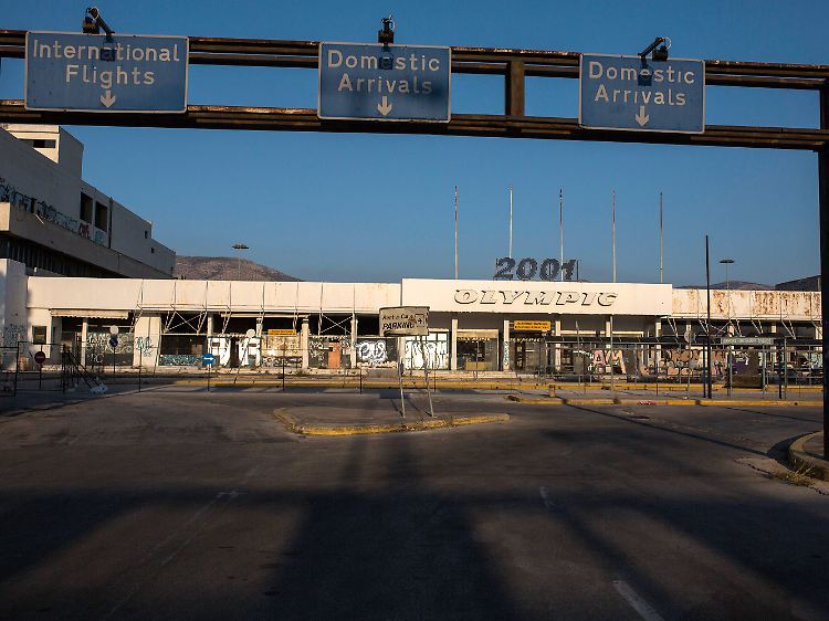 Bereits 2001 wurde der Flughafen stillgelegt; keine zweihundert Meter entfernt rauschen die Wellen an den Strand, dazwischen verläuft eine sechsspurige Stadtautobahn. In den letzten Jahren haben hier tausende Flüchtlinge illegal gecampt; Müll, verlassene Zelte und Wäscheleinen zwischen Betonsäulen zeugen davon.