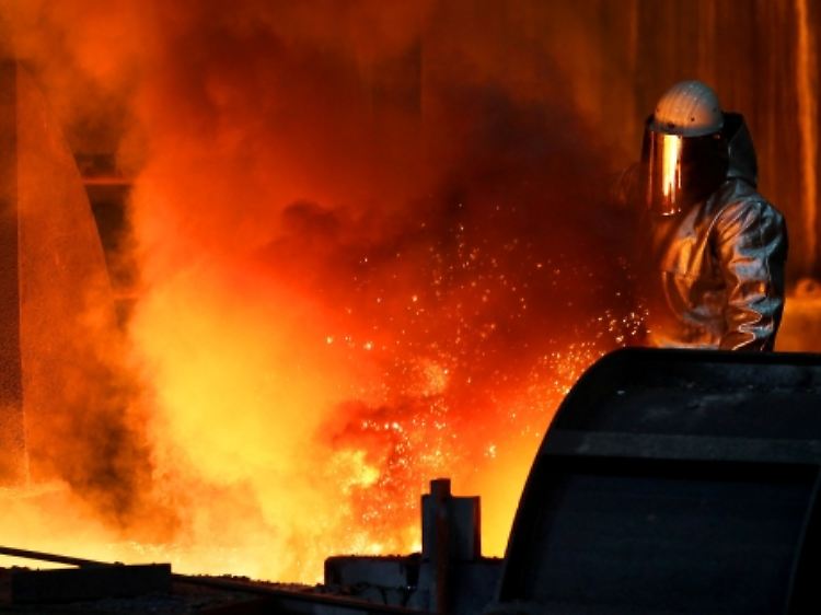 Mehr als nur "schön warm": Ein Mitarbeiter von Thyssenkrupp zieht im Duisburger Stahlwerk am Hochofen ein Probe.