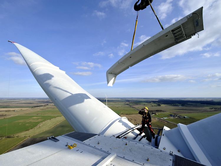 Arbeiten im Himmel über Nordfriesland: Bei Ellhöft an der deutsch-dänischen Grenze drehen sich seit dem Frühjahr die Flügel von 6-Megawatt-Anlagen mit einer Nabenhöhe von gut 100 Metern.