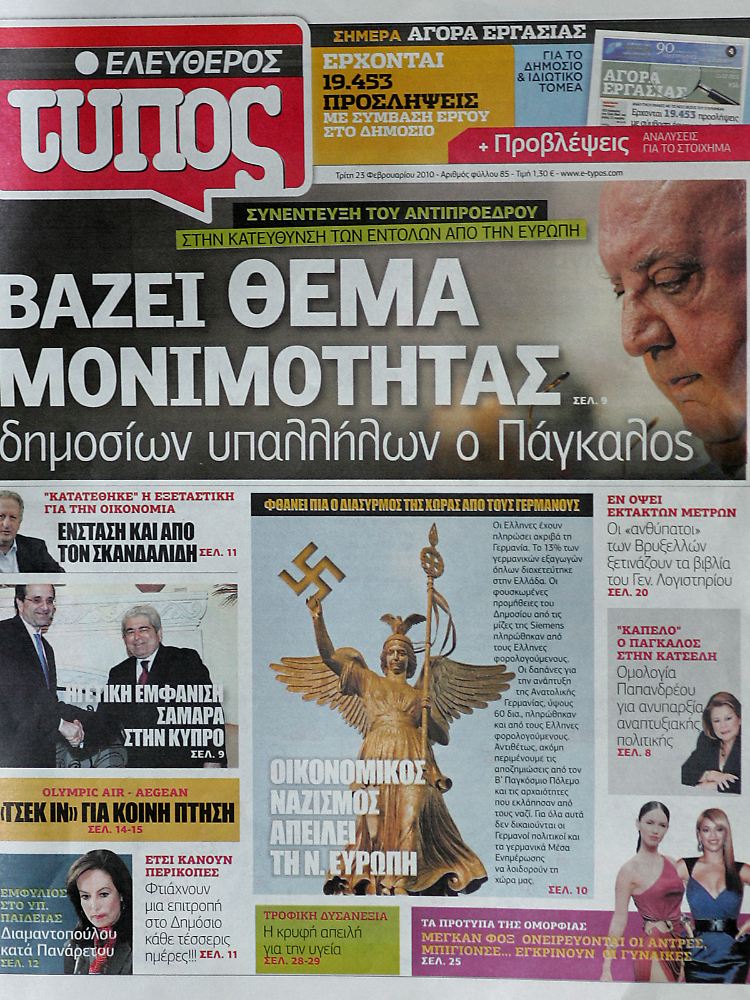 Der Streit über europäische und damit auch deutsche Hilfen für das hoch verschuldete Griechenland belastet zunehmend die politischen Beziehungen. Der deutsche Botschafter in Griechenland, Wolfgang Schultheiss, hatte das "Focus"-Titelbild bereits bedauert und erklärt, Deutschland stehe auf der Seite Griechenlands. "Die Erklärung des Botschafters reicht nicht", sagte Verbandspräsident Lakouritis. "Wer solche Freunde hat, der braucht keine Feinde mehr."