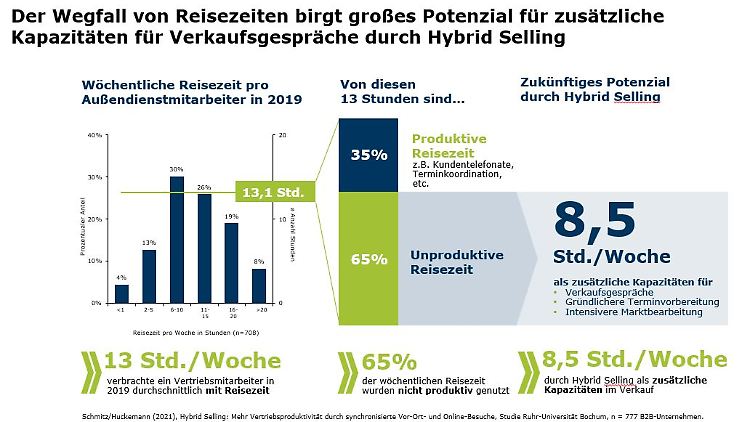 Bei den schlummernden Ressourcen wird die Studie noch konkreter: "Als Vertriebler kannst du vier Mal produktiver sein", haben die Forscher errechnet. "Der Wegfall von Reisezeiten birgt 8,5 Stunden pro Woche je Mitarbeiter an zusätzlichen Kapazitäten für weitere Verkaufsgespräche, intensivere Vorbereitung und intensivere Marktbearbeitung."