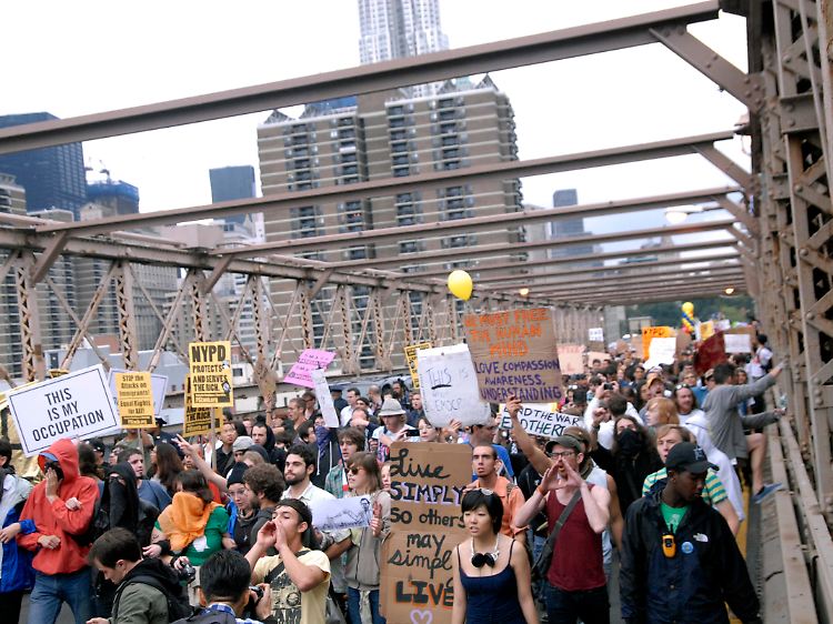Bei Protesten gegen die Verantwortlichen der Finanzkrise und die Macht der Banken sind in New York mehr als 700 Menschen festgenommen worden. Die Polizei begründete ihr Vorgehen damit, dass die Demonstranten die Brooklyn Bridge, eines der Wahrzeichen der US-Metropole, blockierten. Ungeachtet des Einschreitens der Polizei setzten hunderte Menschen den Protest fort.