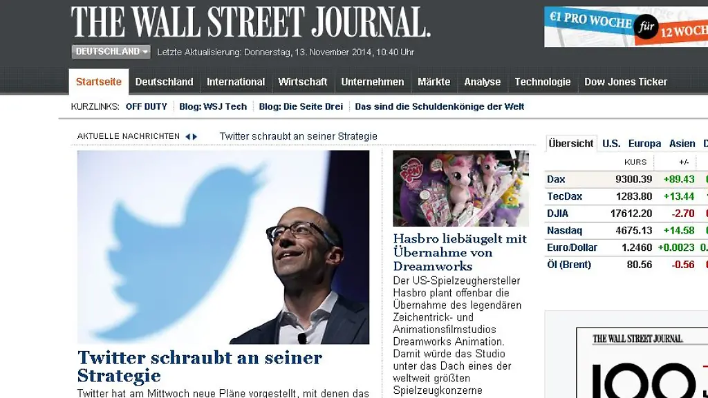 Der deutsche Online-Ableger des "Wall Street Journal" wird zum Jahresende eingestellt. "In Europa schließen wir die deutschsprachige Website und unseren Service in türkischer Sprache", schrieb Gerard Baker, Chefredakteur des "Wall Street Journal", Mitarbeitern in einer internen Email. Der US-Medienkonzern Dow Jones hatte das für Leser kostenpflichtige Projekt in Deutschland erst Anfang 2012 gestartet - offenbar ohne nachhaltigen Erfolg.