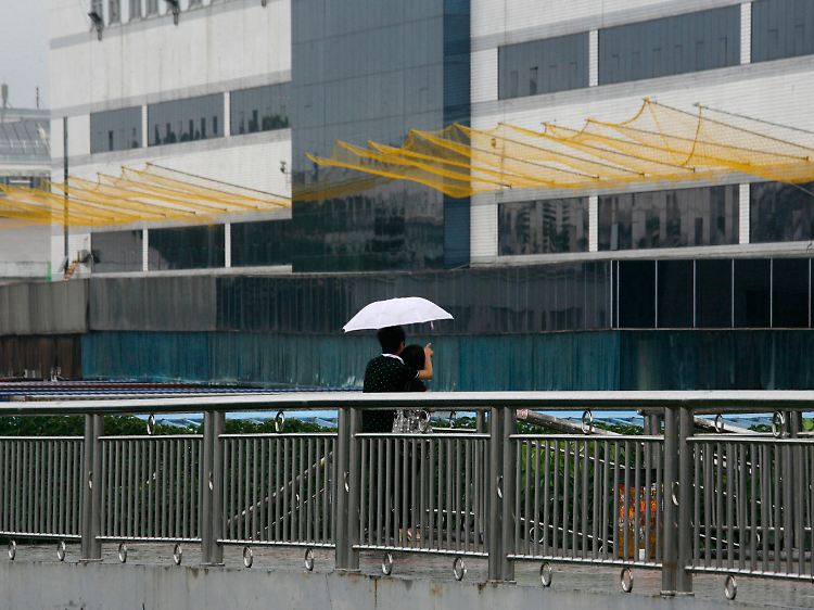 Ein Pärchen betrachtet die neu installierten Netze an der Fassade der Foxconn-Fabrik. Die Netz sollen Lebensmüde beim Sprung in die Tiefe auffangen.