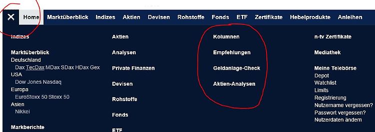 Klicken Sie auf die drei Streifen neben "Home" und öffnen Sie damit die Flyout-Navigation. Hier kommen Sie nicht nur mit einem Klick zu den verschiedenen Rubriken. Zudem finden Sie auch noch einen Direktlink zu den aktuellen Empfehlungen, der Übersicht der Aktien-Analysen oder dem Geldanlage-Check.