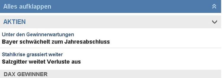 Sie interessieren sich für Aktien, Rohstoffe und Fonds? Dann klappen Sie sich die entsprechenden Rubriken einfach auf! So haben Sie auf einem Blick die aktuellen Beiträge und Kurse zu Ihrer favorisierten Anlageklasse.