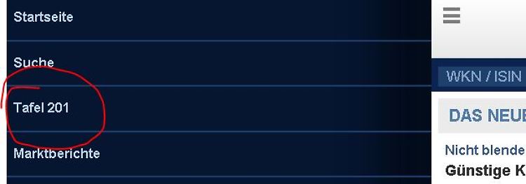 Und zu guter Letzt noch eine kleine Überraschung für Sie: Sie mögen die n-tv Teletext Tafel 201? Unter dem Navigationspunkt "Tafel 201" können Sie sich jetzt auch mobil einen schnellen Kursüberblick verschaffen.