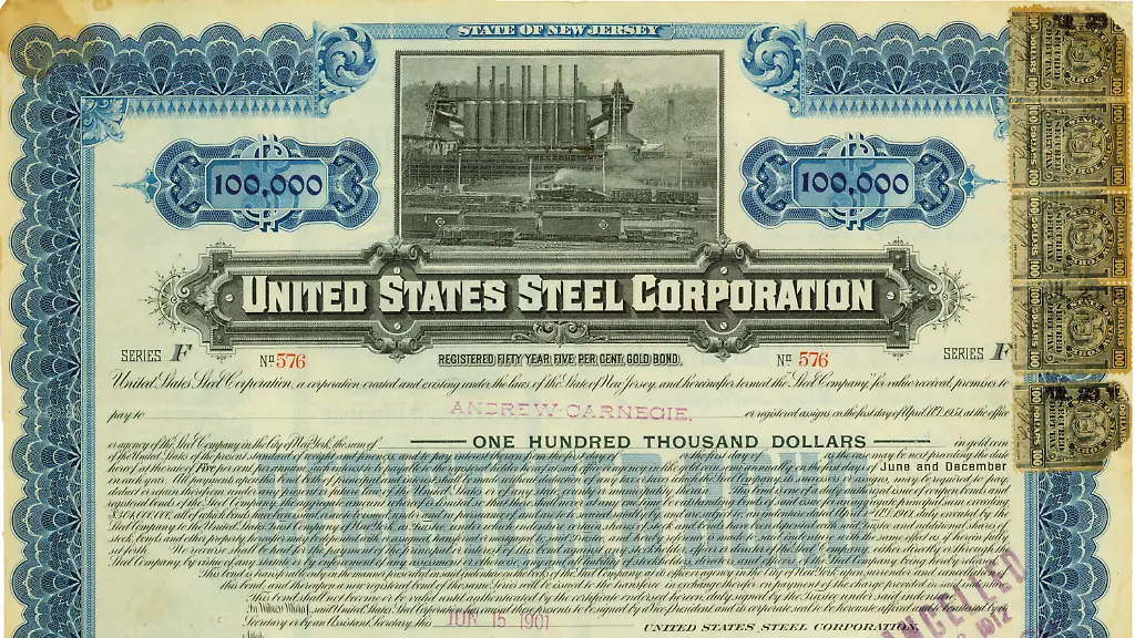 Versteigert wird eine Anleihe aus dem Jahr 1901, die von dem US-amerikanischen Großindustriellen Andrew Carnegie unterschrieben ist und auf der Welt wohl nur noch in acht Ausführungen existiert. Das Mindestgebot für diese Anleihe der United States Steel Corporation liegt dem Historischen Wertpapierhaus zufolge bei 25.000 Euro.