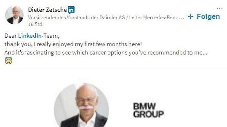 Zetsche nahm es mit Humor: "Liebes LinkedIn-Team, Danke, ich habe meine ersten Monate hier sehr genossen! Und es ist faszinierend zu sehen, welche Karriereoptionen ihr mir vorschlagt..." Großartig!