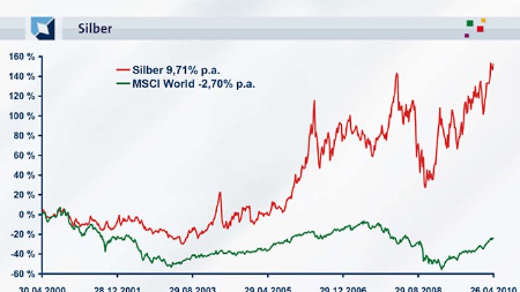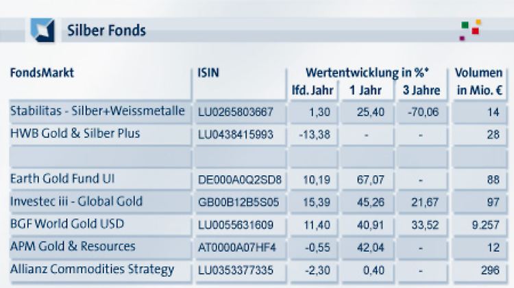 Aktienseitig nutzen führende Rohstoffaktienfonds Silberproduzenten als Beimischung. Lange wurde der Nachfrageüberhang beim Silber über enorme Lagerbestände bedient. Allein 1997 waren 325 Millionen Unzen auf dem Weltmarkt. Zwischen 1990 und 2005 herrschte weitgehend Preisstabilität. Das ist jetzt anders. Analysten sehen Silber vor deutlichen Preissteigerungen. Über ein Jahr ist der Silberpreis per 26. April 2010 auf Eurobasis +39,85 Prozent gestiegen. Über drei Jahre +36,94 Prozent.