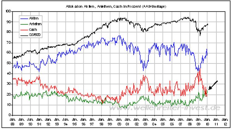 Laut Umfrage der „American Association of Individual Investors (AAII)“ bewegt sich der Anteil der Anleihen an den Gesamtinvestments mit etwa 25 Prozent auf einem 20-Jahres-Hoch (grüne Linie folgender Chart).