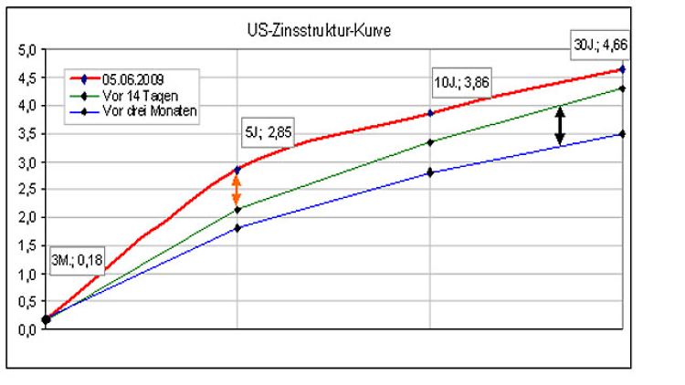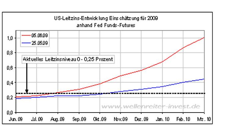 Noch vor 14 Tagen (25.Mai; blaue Linie) erwarteten die Futures-Trader bis zum Jahresende praktisch keine Leitzinsveränderung. Dies hat sich komplett geändert: Am Freitag befand sich die Konsenserwartung für den US-Leitzins für den Dezember bei knapp 0,6%; für den März 2010 bereits bei 1 Prozent.