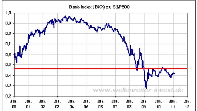 Betrachtet man die Ratio des US-Bankensektors zum S&P 500 auf einer längerfristigen Basis, so wird klar, dass die US-Banken nicht der Treiber der seit März 2009 laufenden Erholungsbewegung sind.