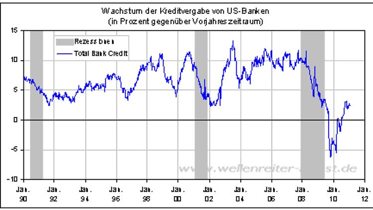 In den Jahren 2009 und 2010 haben die Banken ihre relative Bedeutung für den S&P 500 nicht zurückgewinnen können. Betrachtet man das Wachstum der Kreditvergabe von US-Banken, dann wir klar warum: Zwischen 1990 und 2008 wurden Zuwachsraten in einem Korridor zwischen 5 und 10 Prozent notiert.