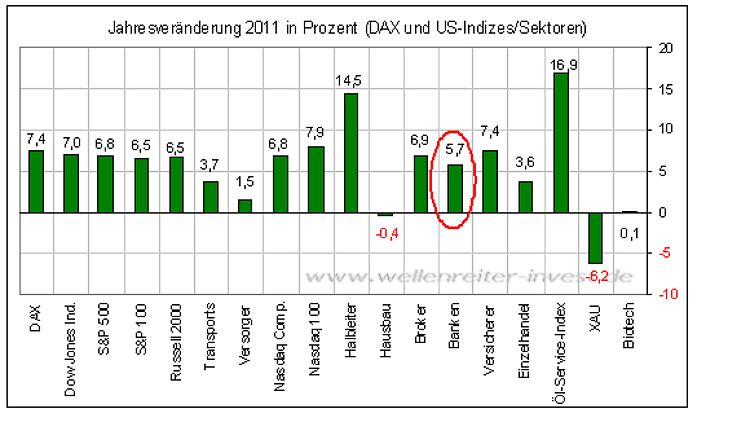 Doch stellt sich die Frage, ob sich die europäische Bankenlandschaft auf Dauer weltweiten Trends entziehen kann. Die USA stellen nach wie vor eine wichtige Bankenadresse dar. Der dortige Banken-Index (KBW) legte in diesem Jahr bisher um 5,7 Prozent zu (roter Kreis folgender Chart).
