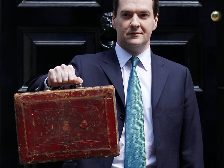 Da drin ist er, der harte Sparplan für die Briten: Schatzkanzler George Osborne mit der traditionellen "Budget Box", einem Lederköfferchen, das seit den Tagen von Amtsvorgänger William Ewart Gladstone (1809 - 1898) eine tragende Rolle in der britischen Haushaltspolitik spielt.