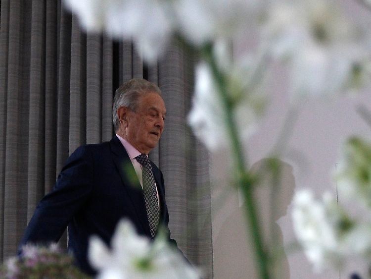 Hinter Blumen in der Humboldt-Uni: George Soros auf dem Weg zu Rednerpult und Regierungsattacke.