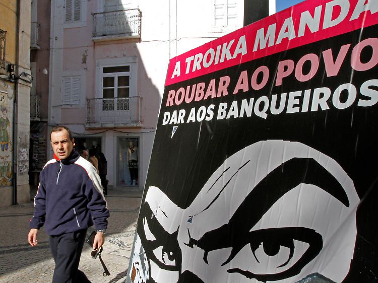 Geballter Protest gegen die Troika in Athen. Auf dem Plakat steht: Die Troika verlangt, "Nehmt es von den Menschen und gebt es den Bankern".