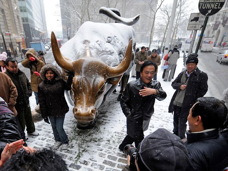 Schnee auf dem Rücken der Bullen-Großplastik unweit der New Yorker Wall Street: Der Jahreswechsel kam im Osten der USA mit Schnee und Frost.