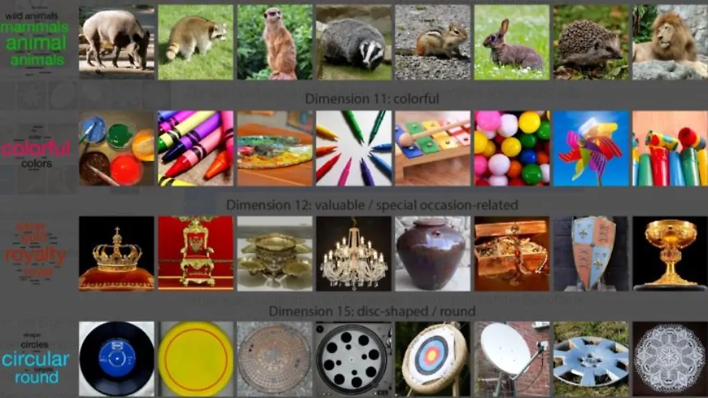 Die Forscher wollten auf diese Art erkennen, nach welchen Merkmalen Menschen Dinge kategorisieren und gruppieren. Besonders aus den individuellen Unterschieden ließ sich ablesen, welche Eigenschaften relevant sind. Bei einer Bildkombination einer Brezel, eines Koalas und eines Teppichs wählt ein Proband beispielsweise den Koala als unähnlichsten Part aus, weil er lebendig oder tierisch ist. Eine andere Person hingegen die Brezel, weil sowohl der Teppich als auch der Koala flauschig sind.