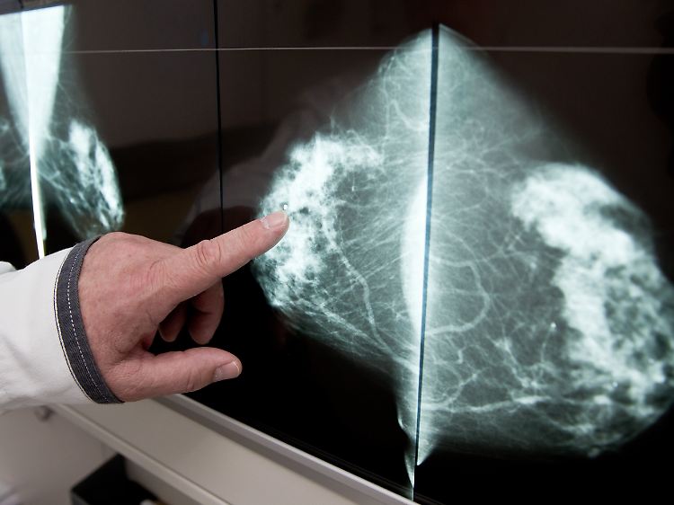 Ein Radiologe deutet auf einer Röntgen-Aufnahme einer Brust auf eine gutartige Fettzellen-Verkalkung.
