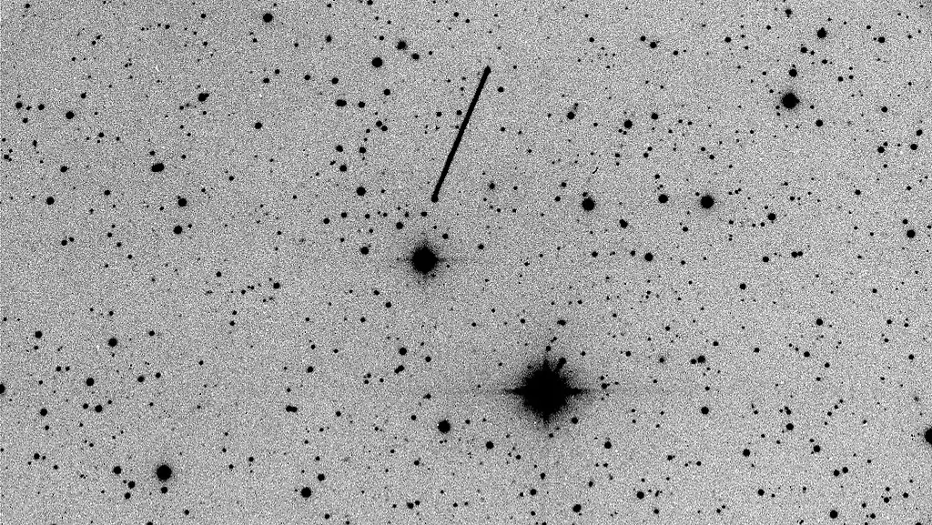Später am Abend sah die Sternwarte den Asteroiden. Auf dem Foto ist er ein langer Streif und nicht ein kleiner Punkt, der sich am Himmel bewegt. Kein Wunder: Die Bilder wurden 20 Sekunden lang belichtet, der rasende Asteroid geriet zu einem hellen Strich.