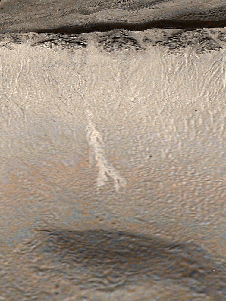 Die Forscher um Lujendra Ojha nun nahmen abermals die auffälligen Fließstrukturen unter die Lupe, die sich im Sommer regelmäßig an manchen Steilhängen auf dem Mars formen. Die in der Regel nur wenige Meter schmalen Rinnen entstehen, wenn die Temperaturen an den Hängen über minus 20 Grad Celsius klettern und immer wieder auch den Gefrierpunkt übersteigen. Sie könnten, so spekulierten die Forscher, von flüssigem Wasser stammen, dessen Gefrierpunkt und Verdunstung durch Salze erheblich herabgesetzt wurde. Dieses Wasser könnte von Eis abschmelzen, das unter dem Marsboden vermutet wird, oder von den Salzen aus der dünnen Marsluft gebunden werden.