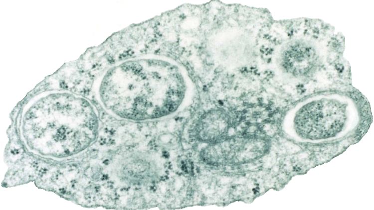 Die mikroskopische Aufnahme zeigt Wolbachia in einer Insektenzelle.