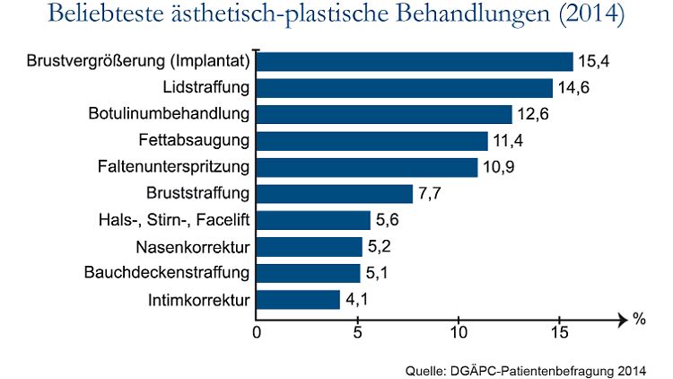 Für die Erhebung befragte die Gesellschaft von Januar bis Juli 2014 deutschlandweit Patienten von 41 niedergelassenen ästhetisch-plastischen Chirurgen. Für die siebte Befragung dieser Art wurden 1300 Fragebögen ausgewertet.